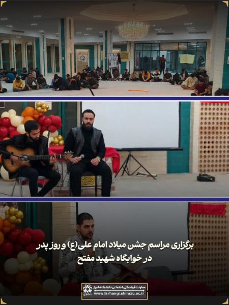 به همت شورای فرهنگی خوابگاه‌های برادران و کانون گردشگری آقایان، مراسم جشن میلاد باسعادت امیرالمؤمنین حضرت علی(ع)، بزرگداشت روز پدر و گرامیداشت یاد و خاطره سردار دل‌ها شهید حاج قاسم سلیمانی، با حضور پرشور دانشجویان برگزار شد.