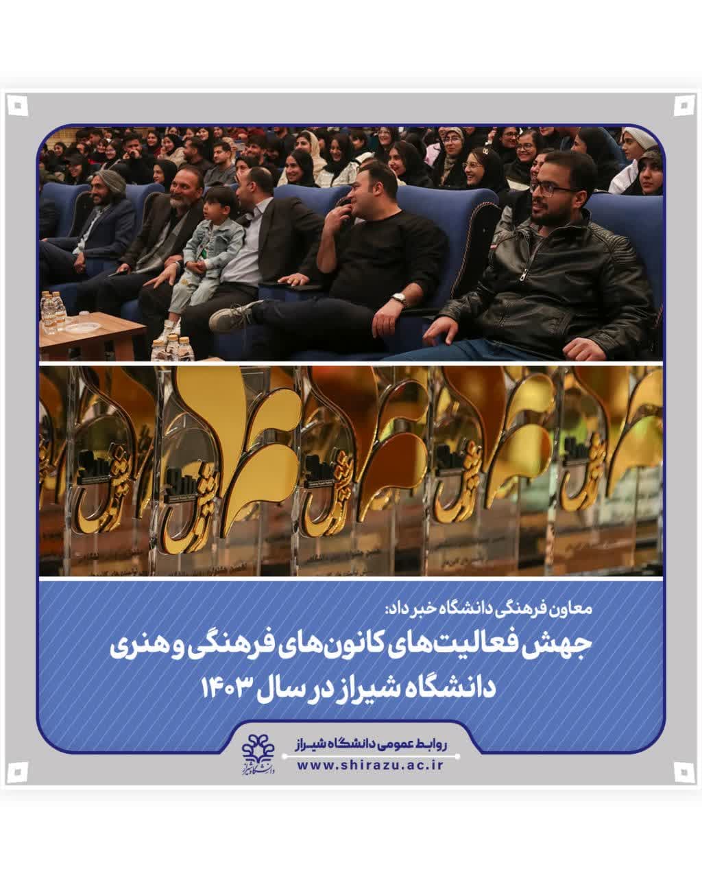 معاون فرهنگی دانشگاه شیراز خبر داد: در سال ۱۴۰۳، ۳۷۲برنامه ازسوی کانون‌های فرهنگی هنری انجام شده است که درمقایسه با سال گذشته که ۲۹۰ برنامه برگزار شده، افزایش یافته است. همچنین تعداد مخاطبان برنامه‌ها که سال قبل ۱۰۳۶۹۳ نفر بوده‌اند به ۲۵۵۴۸۲ نفر (بیش‌از 2 برابر) افزایش یافته است.