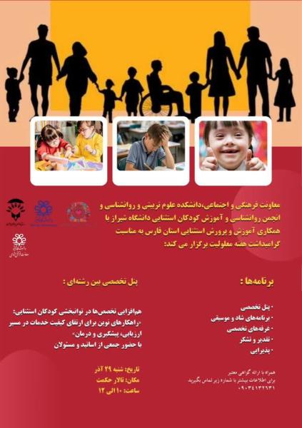 معاونت فرهنگی و اجتماعی دانشگاه شیراز، دانشکده علوم تربیتی و روانشناسی و انجمن روانشناسی و آموزش کودکان استثنایی دانشگاه شیراز با همکاری آموزش و پرورش استثنایی استان فارس به مناسبت هفته معلولیت برگزار می کنند:
